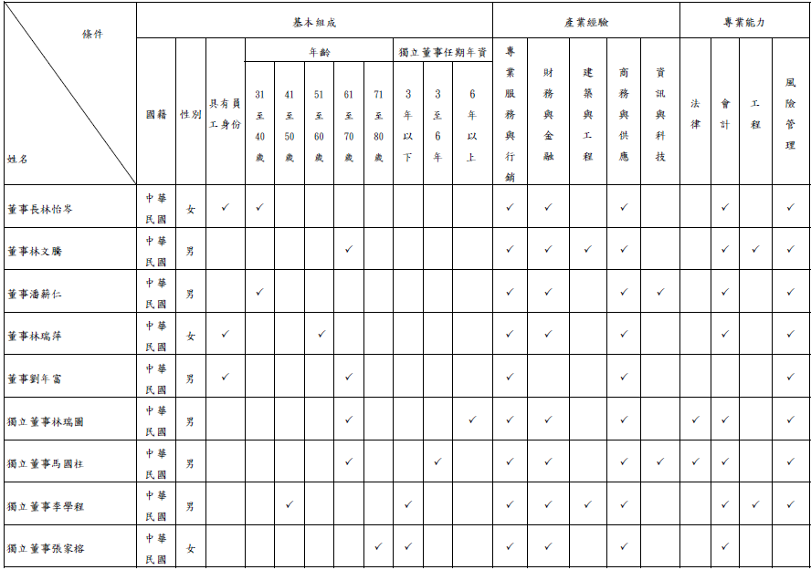 - 專業知識與技能:專業背景(如法律、會計、產業、財務、行銷或科技)、專業技能及產業經歷等。
